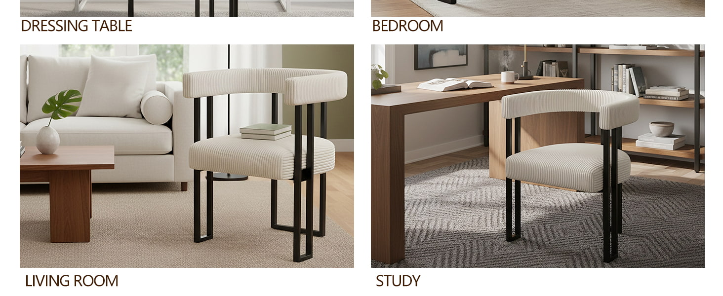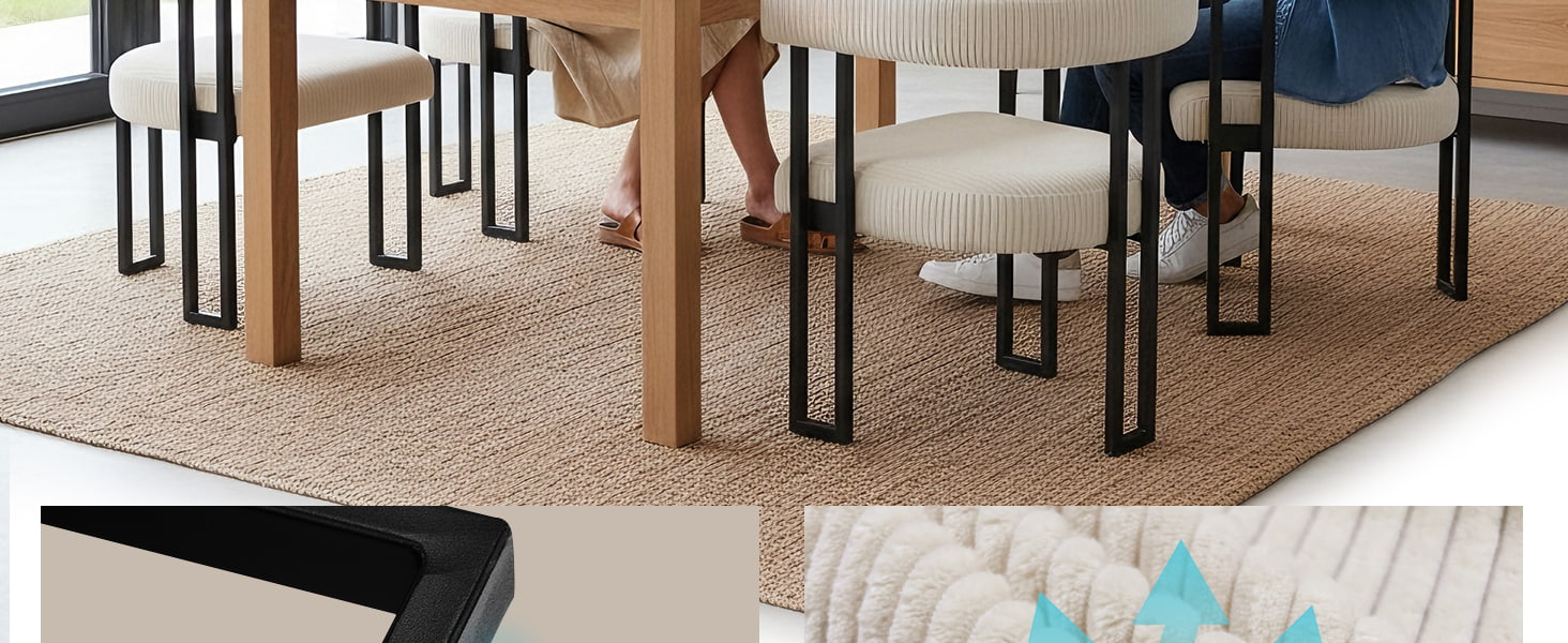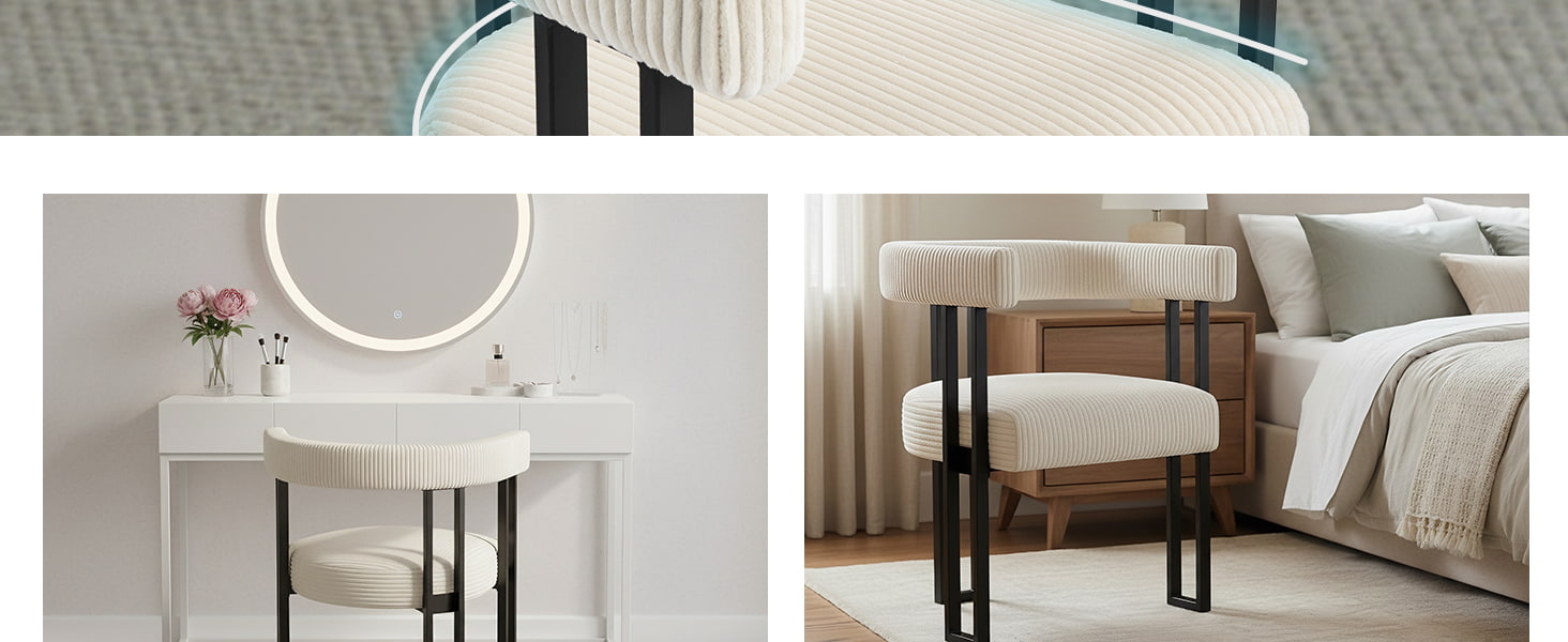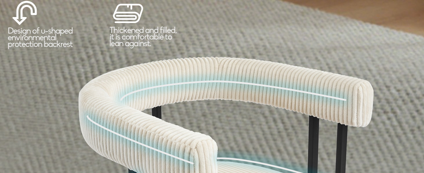 座面には高反発フォームが充填されており、時間が経っても形状が維持され、ダイニングテーブル、ドレッシングテーブル、またはホームオフィスのデスクで使用しても信頼性の高いサポートを提供します。考え抜かれて設計された U 字型の背もたれは、人間工学に基づいて腰と背中をサポートし、長時間座っているときの疲労を軽減します。