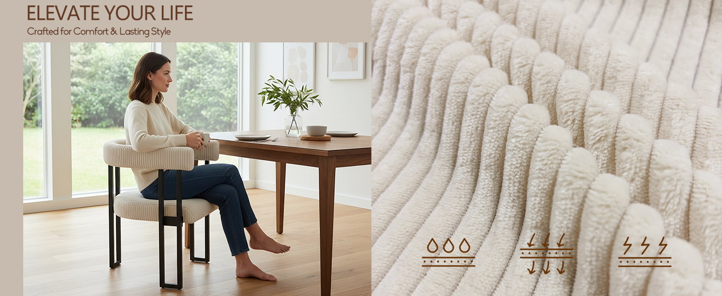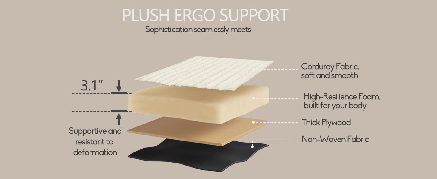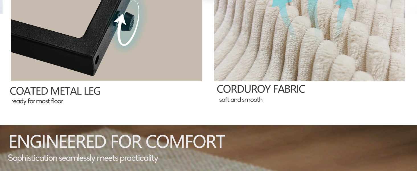 ●プラッシュコーデュロイ張り地:ソフトタッチのブークレコーデュロイ生地は、耐久性とお手入れが簡単でありながら、暖かく質感のある感触を提供します。
