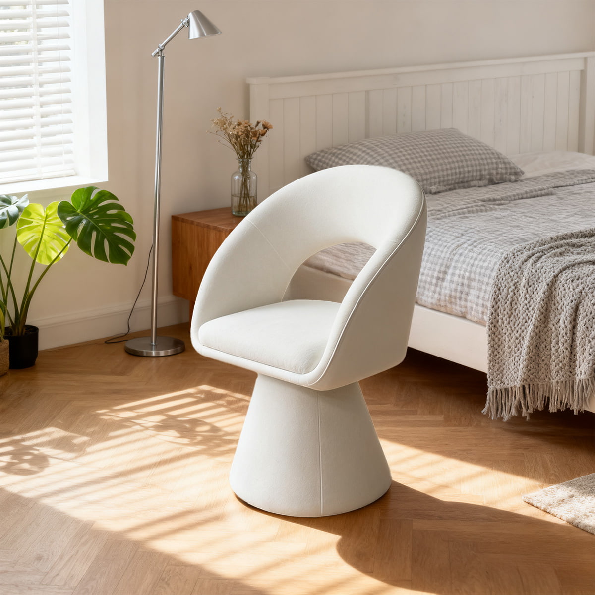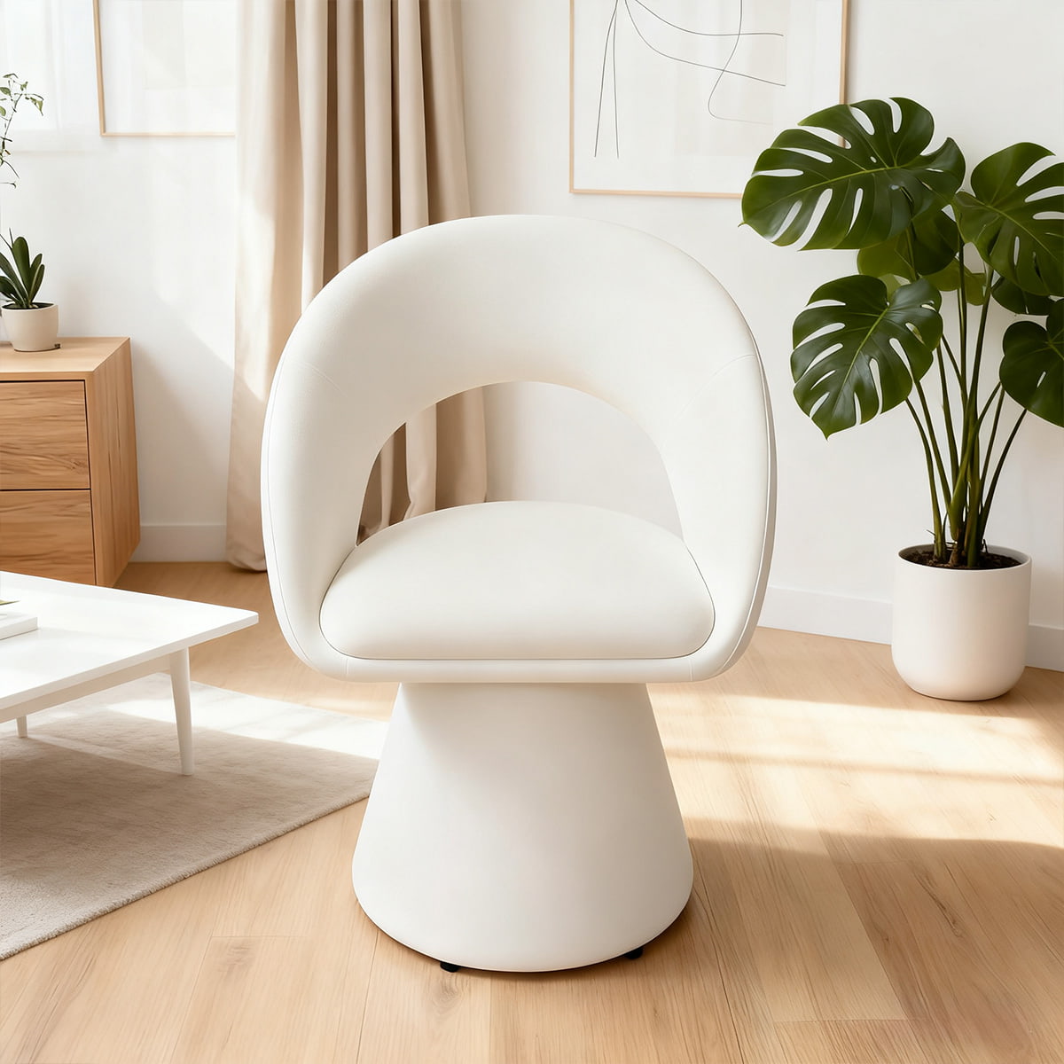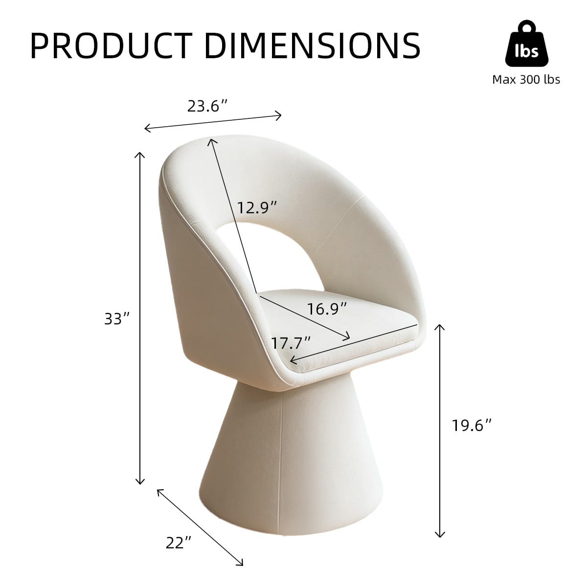 モダンな曲線デザインの回転クリーム ホワイト テディ ベルベット アクセント チェア – 360 度回転する布張りのダイニング & レジャー チェア、中空の背もたれ付き