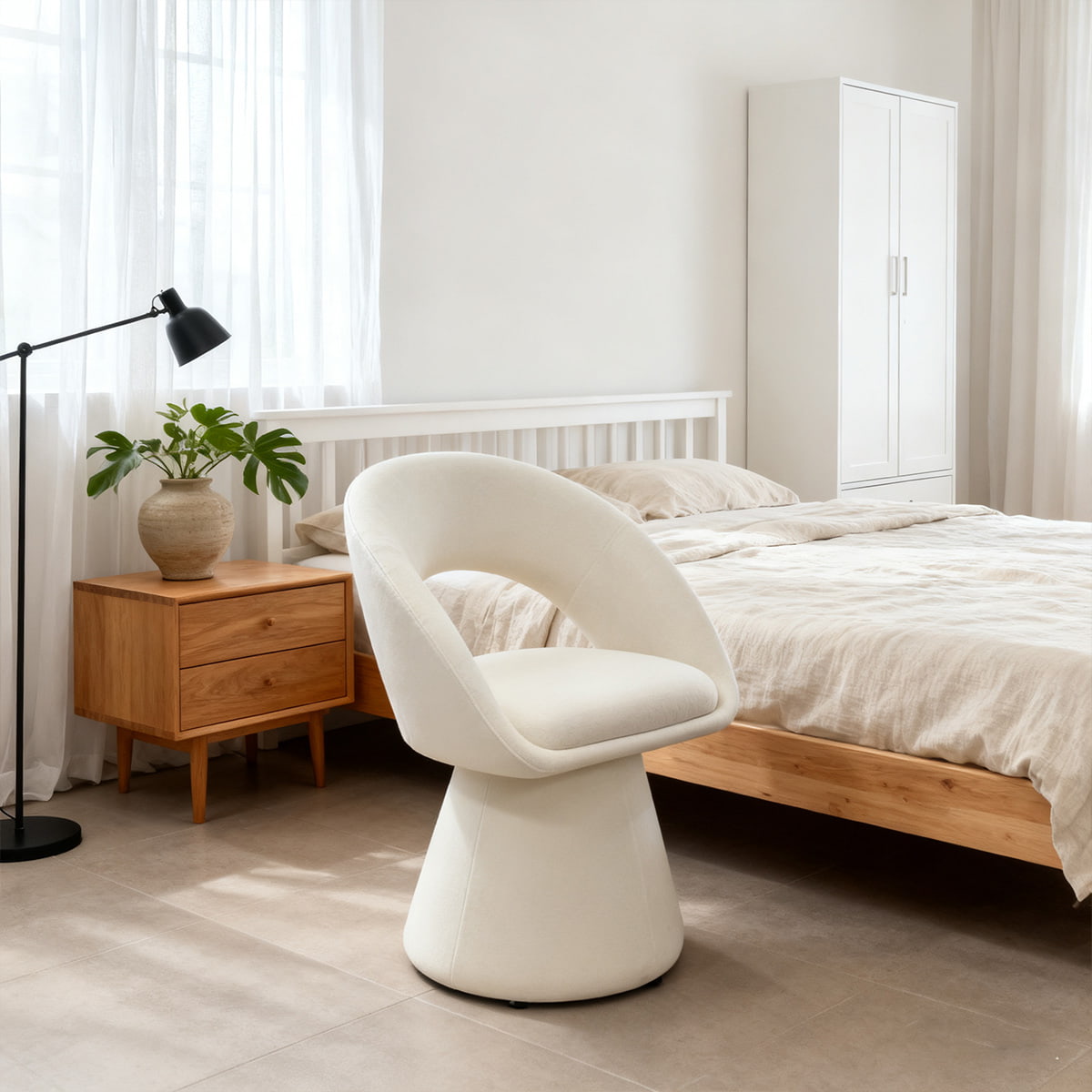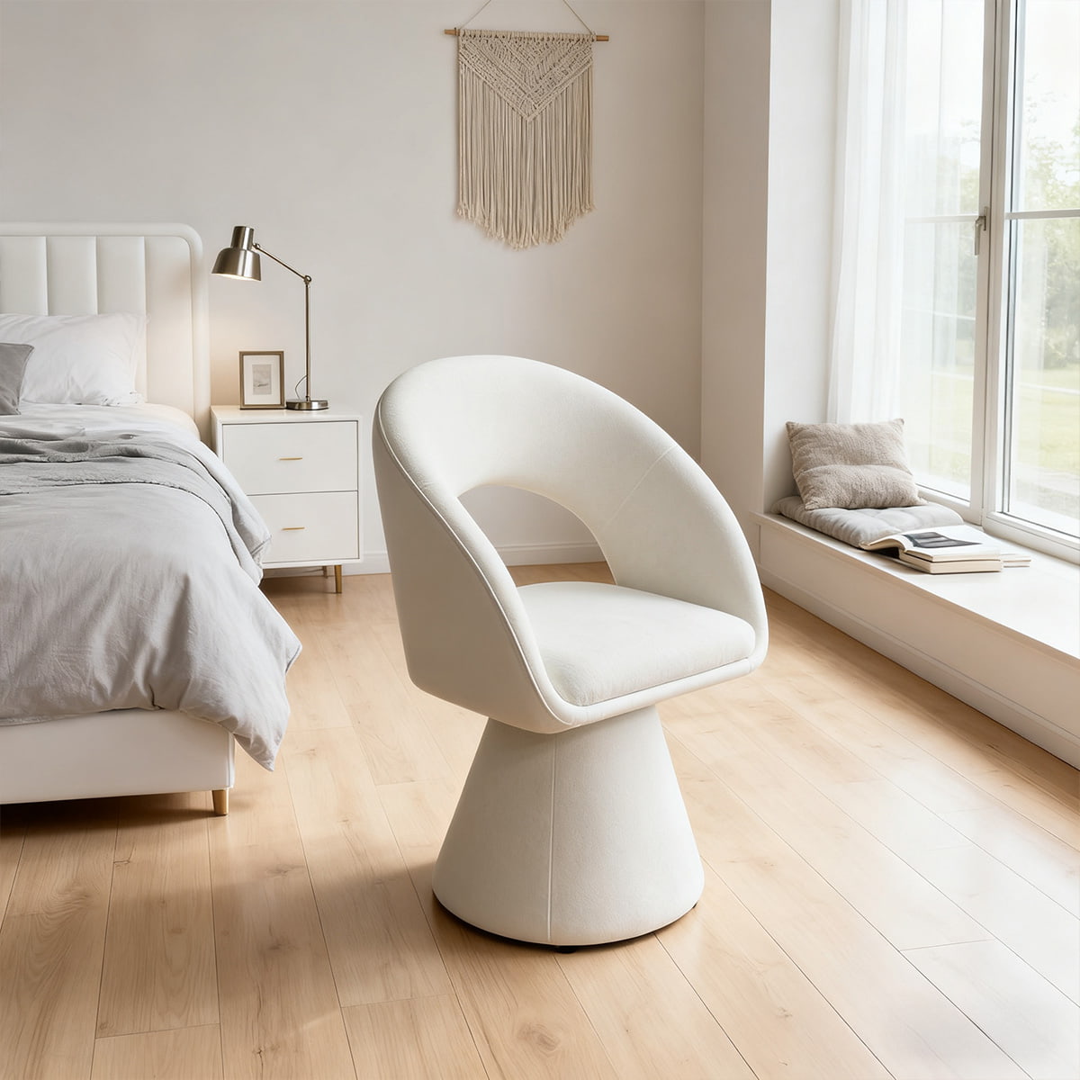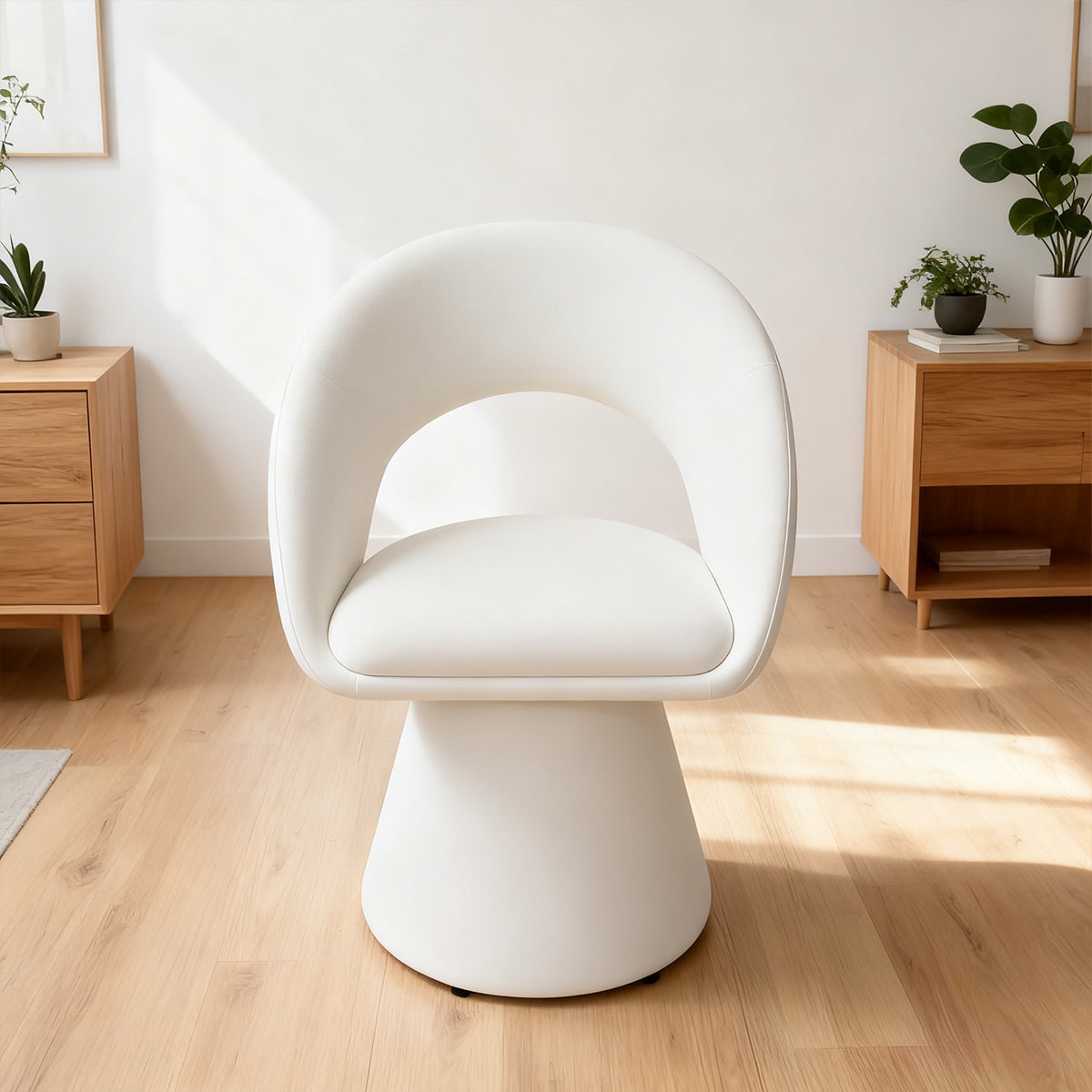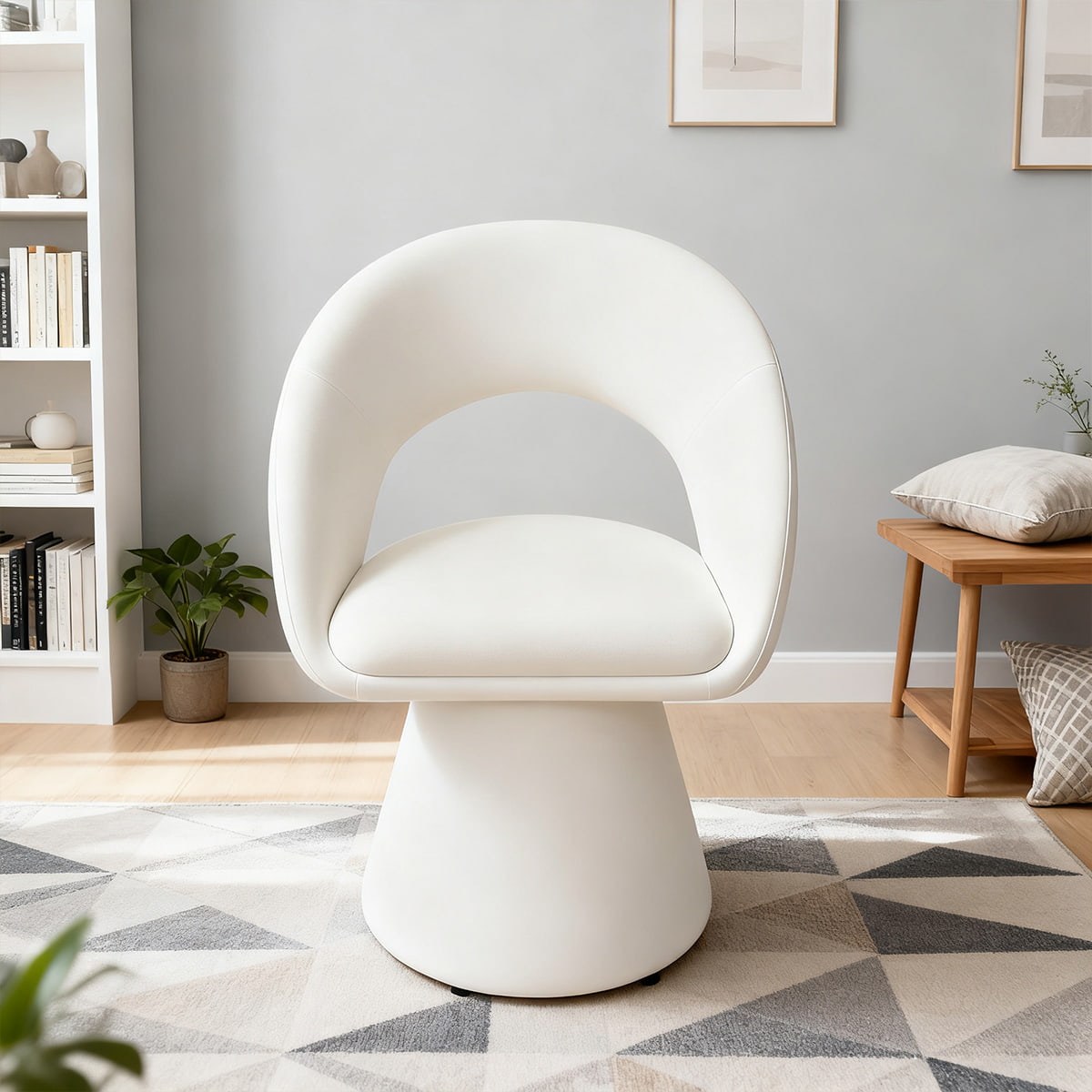 モダンな曲線デザインの回転クリーム ホワイト テディ ベルベット アクセント チェア – 360 度回転する布張りのダイニング & レジャー チェア、中空の背もたれ付き