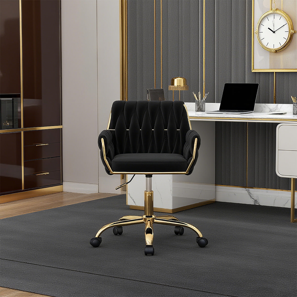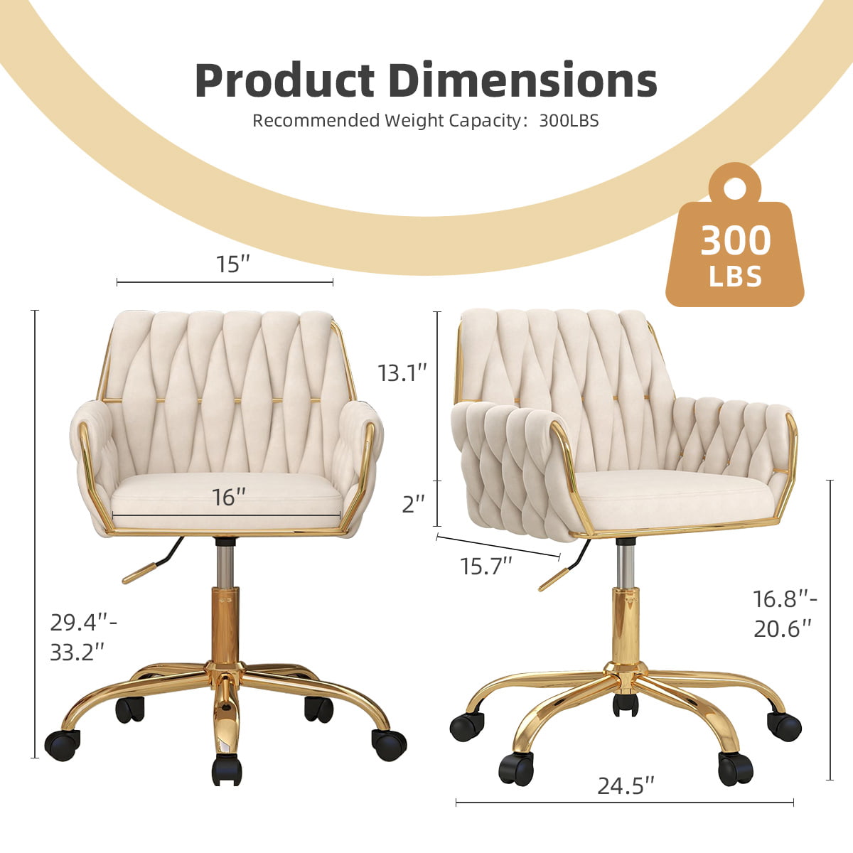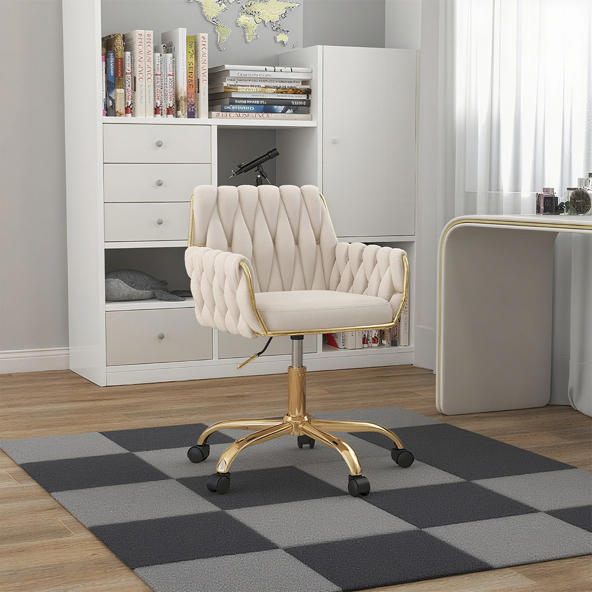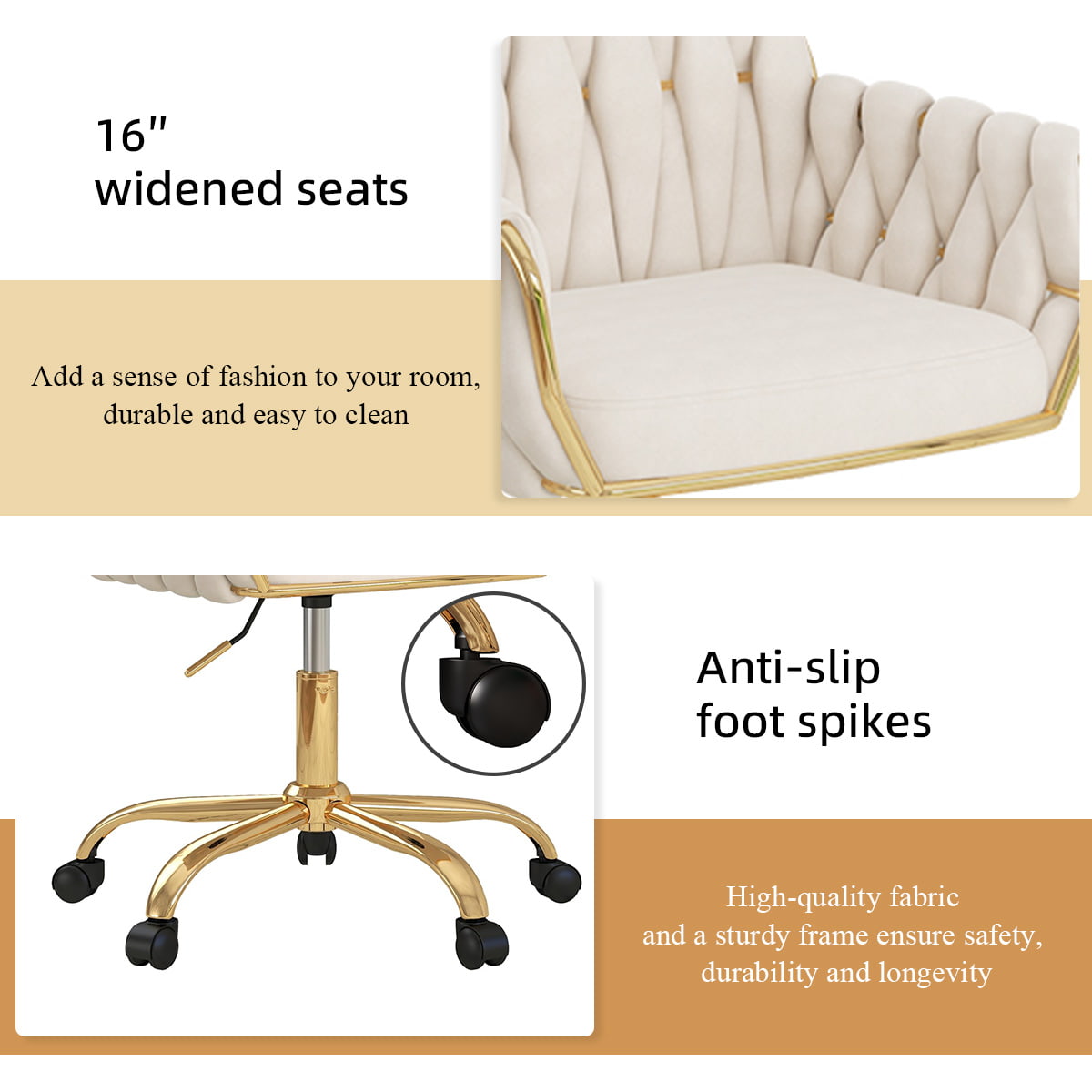 ベージュベルベットのホームオフィスチェア – モダンな調節可能なバニティチェア、ゴールドベース、手編みの背もたれとアームレスト、360°回転ローリングデスクチェア