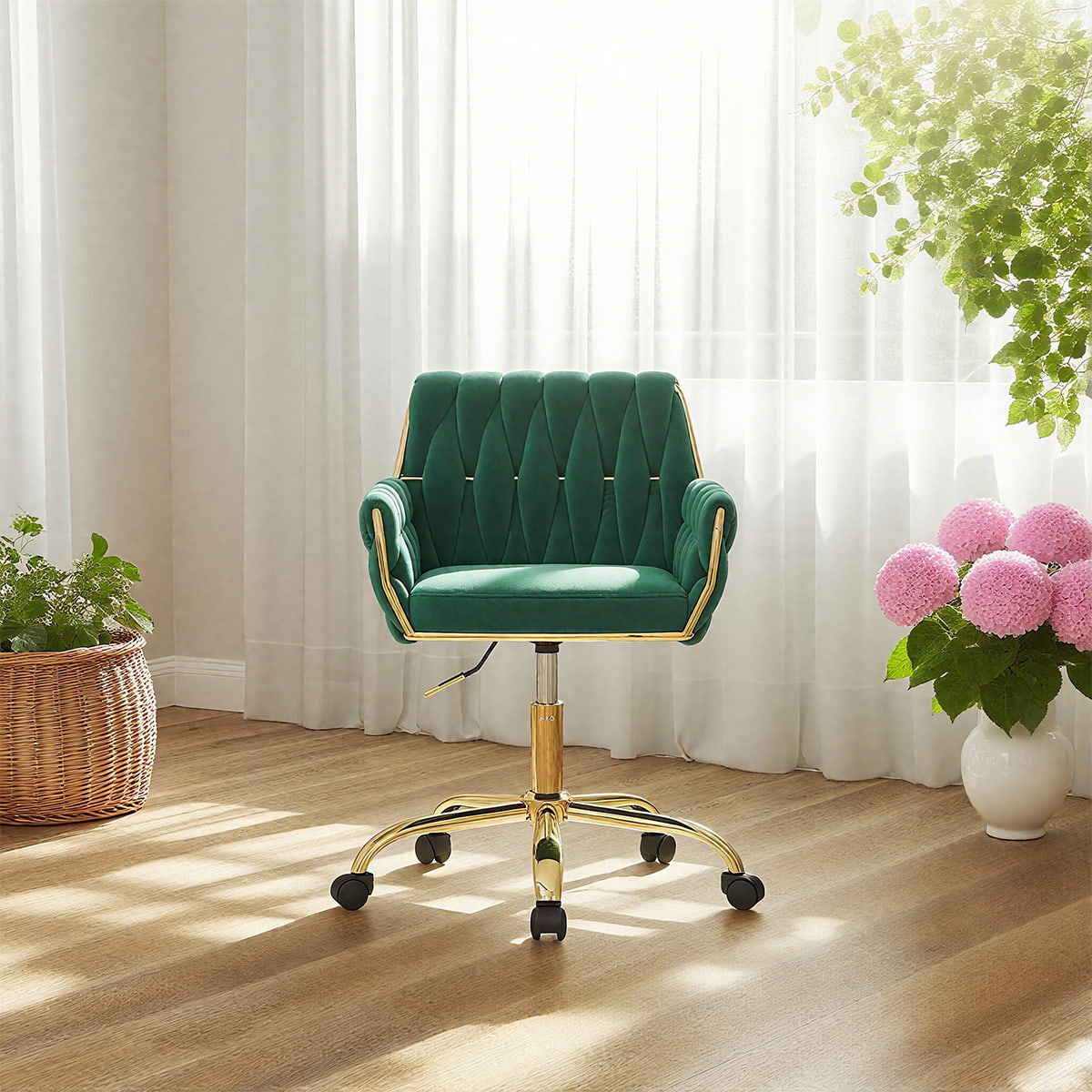 ゴールドのベースが付いたこのモダンなベージュのベルベットのオフィスチェアは、化粧椅子、ホームオフィスのデスクチェア、書斎の回転椅子に最適です。豪華なベルベットの室内装飾、人間工学に基づいた編み込み背もたれ、パッド入りの肘掛け、調節可能な座面の高さが特徴で、インテリアの装飾を高めながら、一日中快適にお過ごしいただけます。スムーズなキャスター付きの 360 度回転ベースにより、仕事、化粧、読書、ゲームなど多目的に使用できます。
