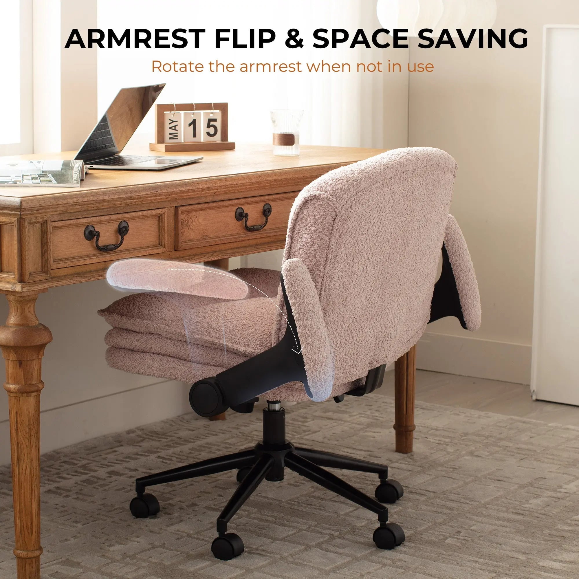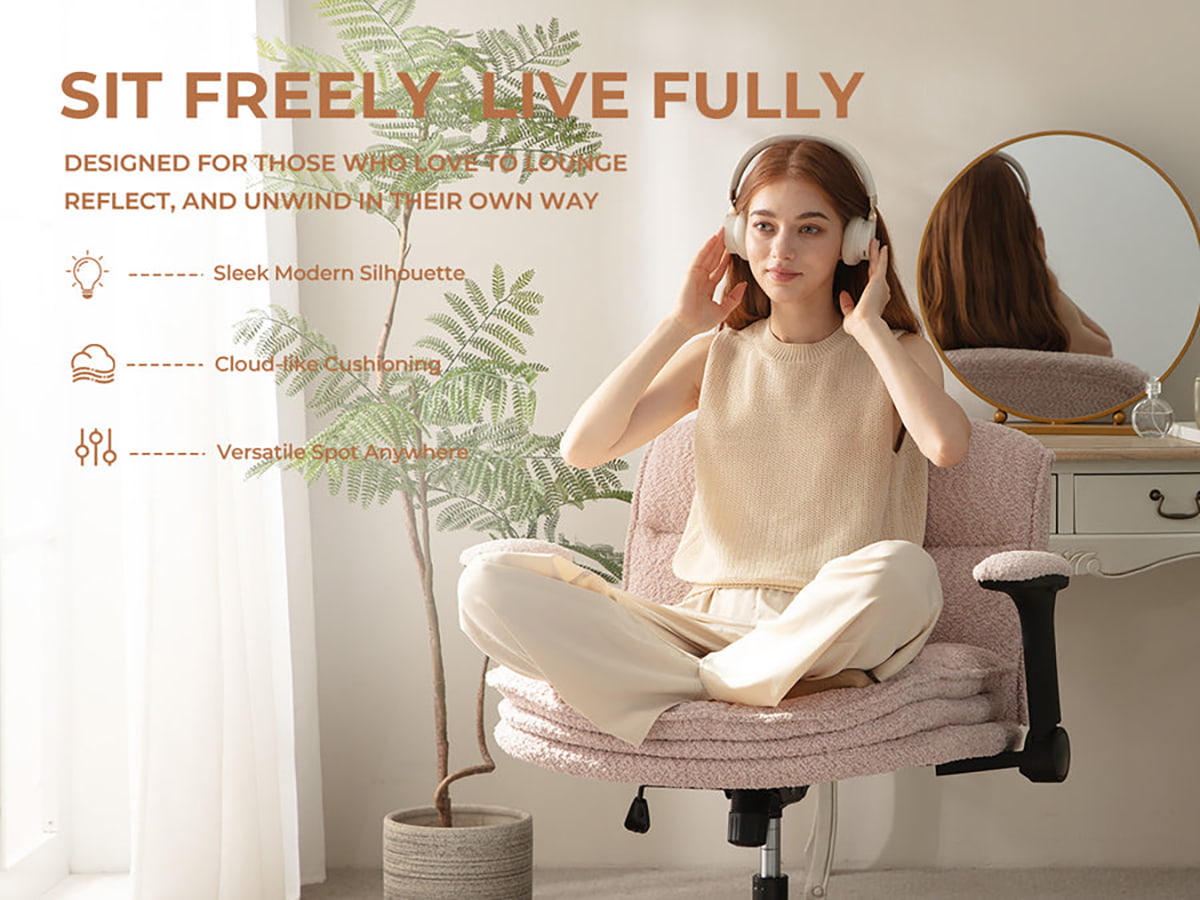 跳ね上げ式アームレストにより柔軟性が最大限に高まり、足を組んだり、横向きに座ったり、丸くなったり、直立したりすることが簡単に行えます。この椅子は、快適さ、動きやすさ、スタイルを重視して作られており、ホーム オフィス、寝室、クリエイティブなスペースに最適です。
