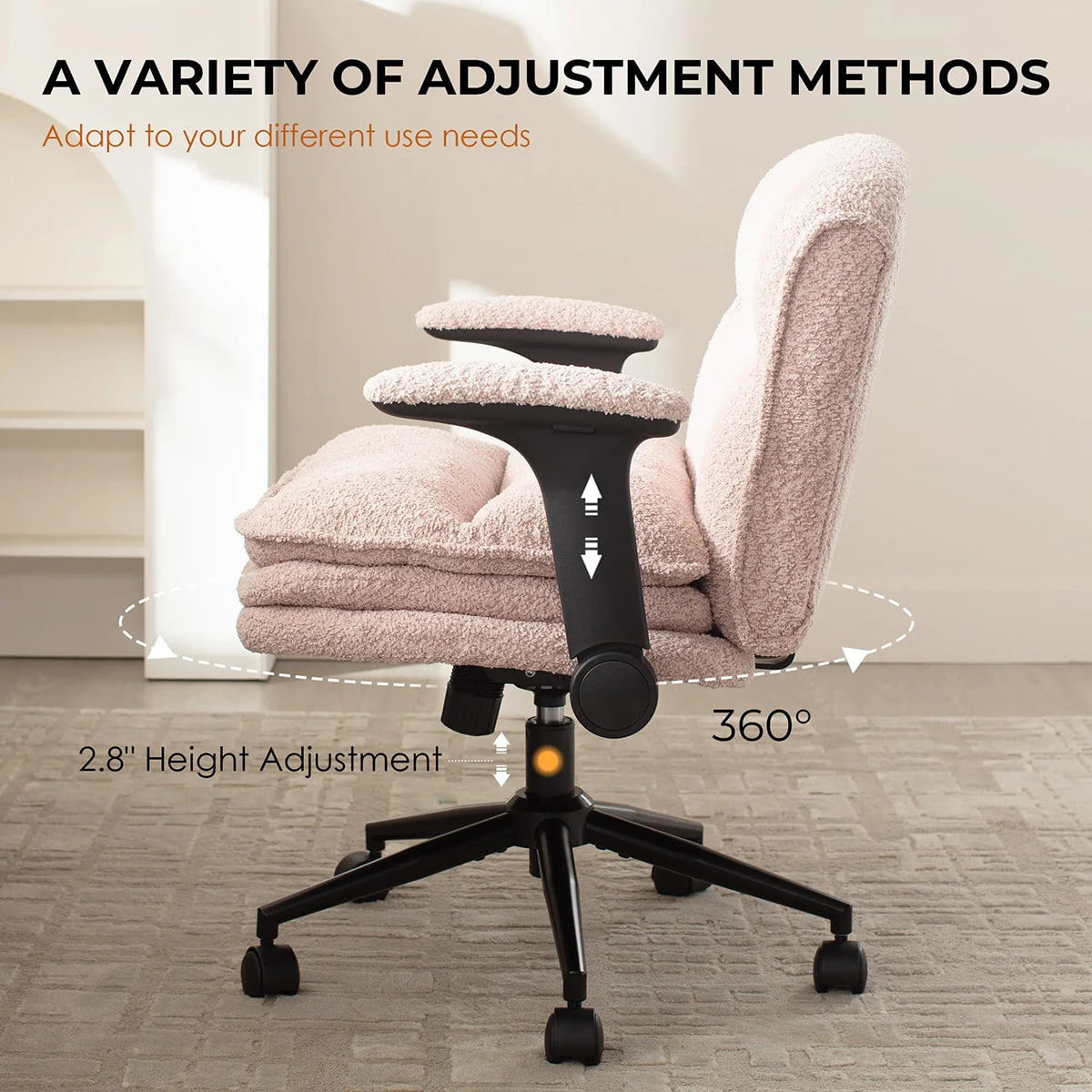 ② 人間工学に基づいたあぐらデスクチェア、調節可能なアームレスト、360°回転、厚いクッション付き — ブークレ ホームオフィスチェア