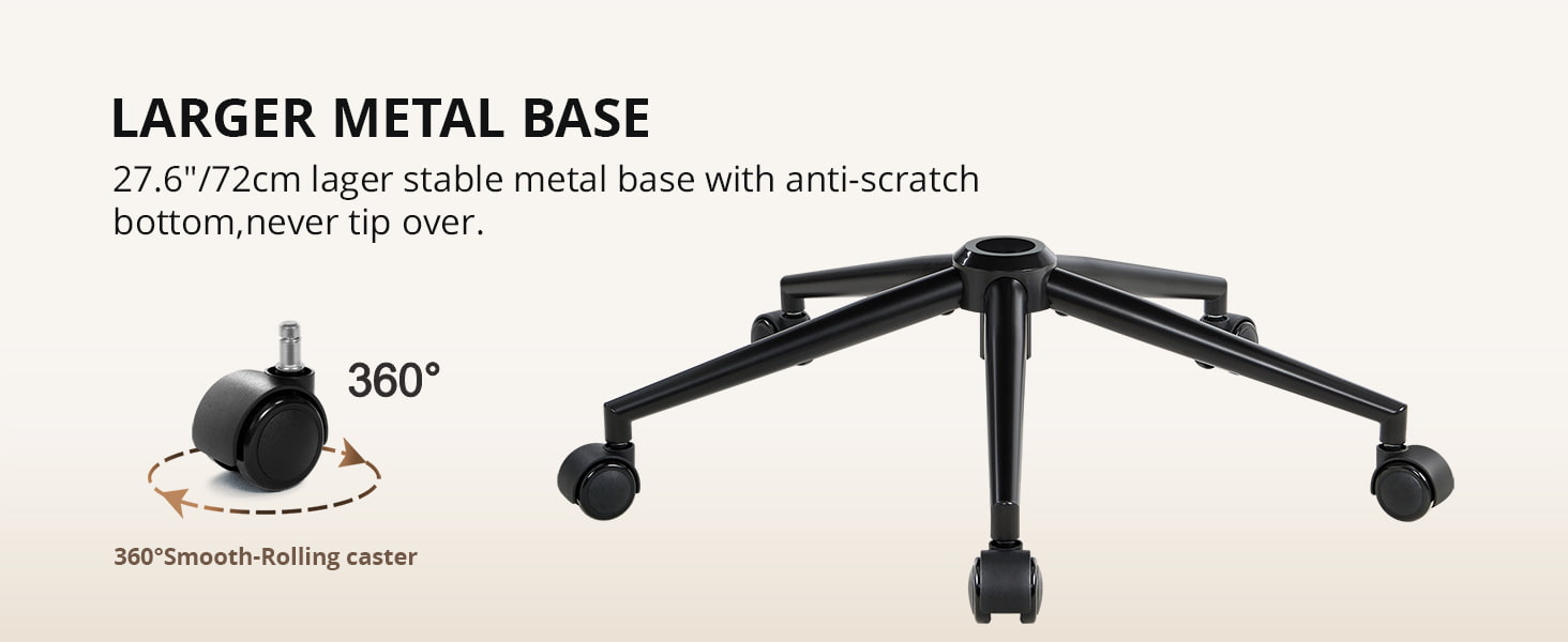 幅広の 72 cm (28.35 インチ) の金属ベースが安定性を確保し、サイレントナイロンキャスターは床を傷つけずにスムーズに回転します。ホームオフィス、書斎、寝室、化粧台のセットアップに最適なこの椅子は、快適さ、美しさ、日常の実用性を兼ね備えています。