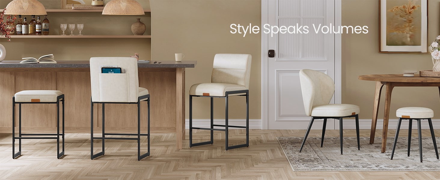 キッチンカウンターやダイニングアイランド用にデザインされたミッドセンチュリーのモダンなバースツールであるこれらのクリームホワイトのカウンターハイトチェアは、洗練されたステッチを施した耐久性のある合成皮革の室内装飾とすっきりとした建築的な金属フレームが特徴です。人間工学に基づいた 103 度のセグメント化された背もたれ、厚さ 3.9 インチのクッション付きシート、湾曲したフロントエッジにより、長時間座っても快適さが持続し、住宅のキッチンとカフェやショールームなどの軽い商業環境の両方に適しています。